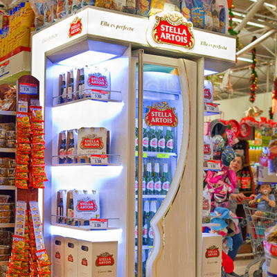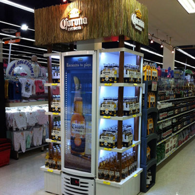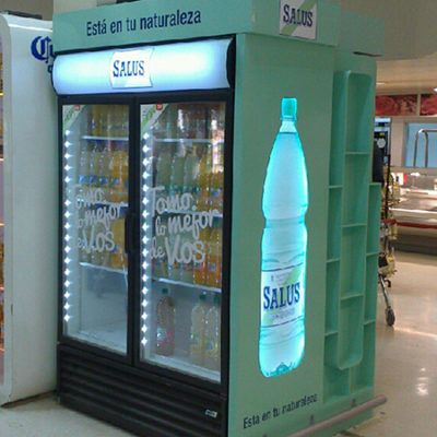 Cabecera de góndola para exhibición de bebidas con heladeras. Cenefa y logotipo en acrílico con iluminación backlight. Estantes con iluminación LED.