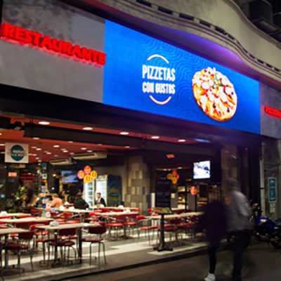 Fachada en aluminio compuesto y letras armadas en acrílico con iluminación LED. Pantalla LED central.