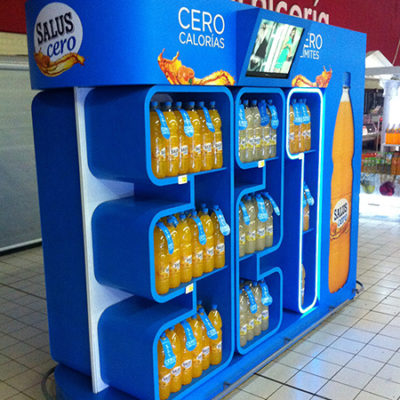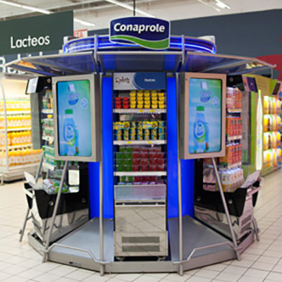 Isla para exhibición de productos refrigerados. Construido en MDF Iluminación LED y pantallas multimedia. Alcance 360 grados.