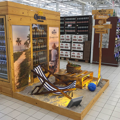 En Madera con logos corpóreos. Vinilo impreso y ambientación playa.
