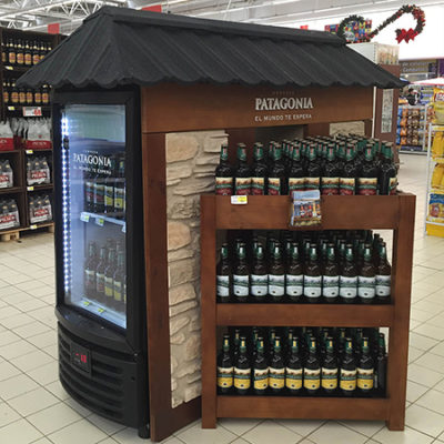 Isla para exhibición de productos refrigerados. Construido en madera y MDF. Letras corpóreas +textura